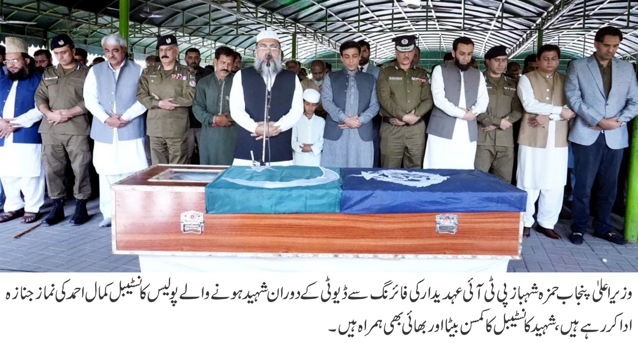 وزیراعلیٰ پنجاب حمزہ شہباز پی ٹی آئی کے عہدیدار کی فائرنگ سے ڈیوٹی کے دوران شہید ہونے والے پولیس کانسٹیبل کمال احمد کی نماز جنازہ ادا کر رہے ہیں، شہید کانسٹیبل کا کمسن بیٹا اور بھائی بھی ہمراہ ہیں