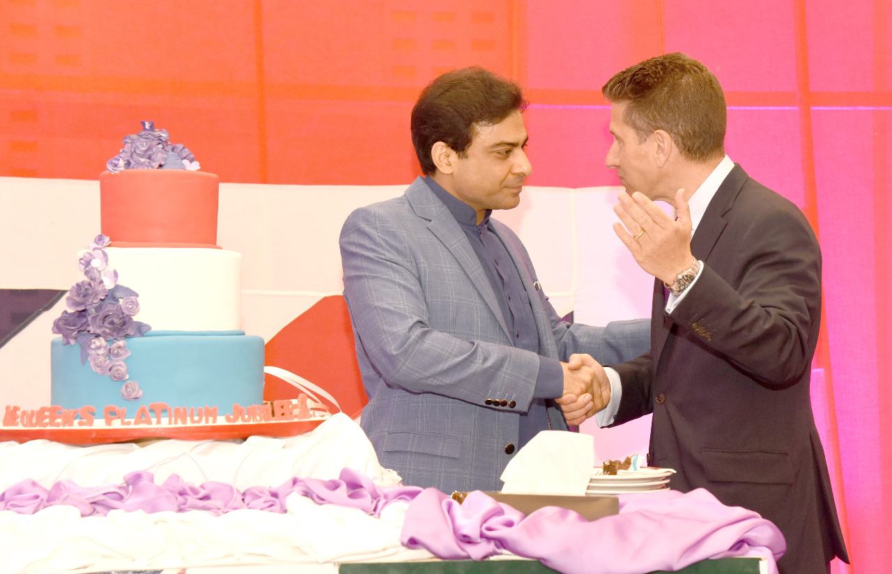 وزیر اعلی پنجاب حمزہ شہباز شریف مقامی ہوٹل میں برطانیہ کے ہائی کمشنر ڈاکٹر کرسچن ٹرنر کو برطانوی ملکہ الزبتھ کی سالگرہ کی مبارکباد دے رہے ہیں
