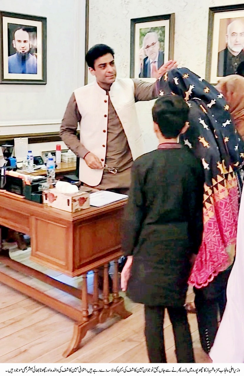 وزیراعلیٰ حمزہ شہباز کاچھو پورہ میں ڈور پھرنے سے جاں بحق نوجوان کاشف مبین کی بہن کو دلاسہ دے رہے ہیں، متوفی مبین کاشف کی والدہ اور چھوٹا بھائی مبشر بھی موجود ہیں
