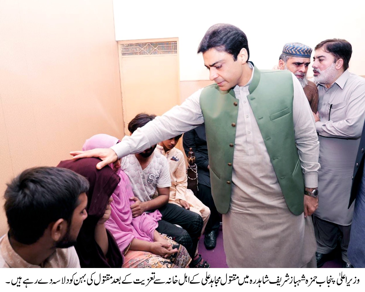 وزیراعلیٰ حمزہ شہباز شریف شاہدرہ میں مقتول مجاہد علی کے اہلِ خانہ سے تعزیت سے اظہار کے بعد فاتحہ خوانی کر رہے ہیں