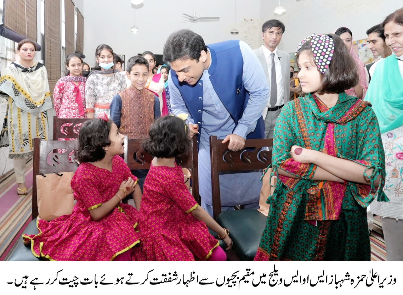 وزیراعلیٰ حمزہ شہباز شریف ایس او ایس ولیج میں مقیم بچیوں سے اظہارِ شفقت کرتے ہوئے بات چیت کررہے ہیں